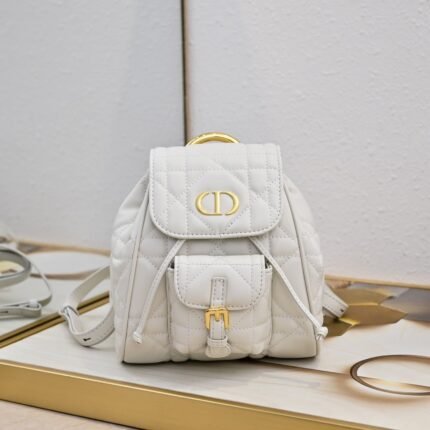 Small size. This Dior Caro backpack is a new product of the early spring ready-to-wear collection in 2025, showing a fashionable and elegant style. Meticulously crafted, it is paired with oversized cannage topstitching to enhance the style. The flap is decorated with a retro gold-finished metal CD logo. After opening, there is a drawstring main compartment. The small flap pocket can hold various daily necessities. Paired with a gold-finished handle and an adjustable shoulder strap for added comfort. Size: 19.5 x 18.5 x 8.5 cm (length x height x width).