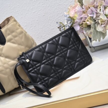 This 28cm large Dior Toujours handbag is casual, practical and unique. It is carefully crafted from beige rope calfskin, decorated with oversized cannage topstitching and black calfskin details. The spacious interior compartment comes with a matching pouch for neatly storing various daily necessities. It features a slender leather drawstring closure for safely storing various items. There is also a CD Lock letter D knob-type buckle that can adjust both sides to enhance the style. Medium size. The leather top handle has adjustable details and can be carried by hand or on the shoulder. D.I.O.R. charm. Removable interior pouch. Adjustable top leather handle. Dimensions: 28.5 x 21.5 x 17 cm (length x height x width). Can hold 2 wallets, 1 mobile phone, 2 card holders, sunglasses and lipstick on top.