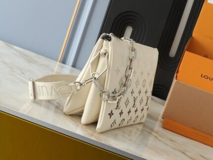 The upgraded original M20369, M22398, M21353, M21209, M57790 black, M57792 bright red, M57793 white, M57936 green, M57913 silver, M58699 light blue, M59278 gold, M57791 khaki, M59276 rose pink, M59275 dark red, M59277 caramel Coussin mini handbag shone brightly at the Spring/Summer 2021 fashion show. The Monogram embossed fluffy sheepskin creates a pillow configuration, injecting avant-garde style into the simple design. It can be carried crossbody with a shoulder strap or transformed into a chain baguette bag, or carried under the armpit. Size: 26 x 20 x 12 cm.