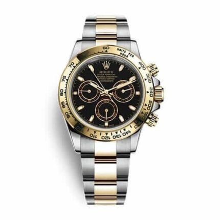 This Rolex Daytona Gold & Steel Black Replica is a stunning watch. It features a 904L stainless steel case and