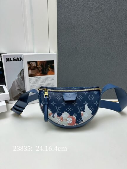 M23835 blue flower, M23838. This LV Moon Crossbody handbag is made of Monogram Eclipse coated canvas with leather trim and shoulder strap. The elegant and handsome atmosphere is self-evident. Blue flower flame rose silk-screened semicircle bag, moon bag, pea bag oo [handshake] [handshake]. The half-moon shape is convenient for cross-body wearing from front to back and can easily hold mobile phones, small wallets and headphones. Size: 24.5 x 16 x 4.5 cm.