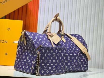 This Keepall Bandoulière 50 travel bag is woven in cotton denim in a Monogram pattern, bleached and sand washed for a retro look. Cow leather molded handle and removable and adjustable shoulder strap for a subtle aged effect, top handle and removable and adjustable shoulder strap for easy boarding. Dimensions: 50-29-22 cm