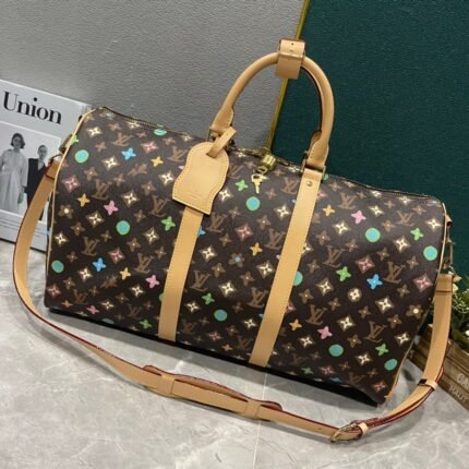 This Lv X YK Keepall 50 combines classic design with iconic details. Made of Damier Graphite canvas, it is in the size of carry-on luggage. It features round leather handles and adjustable and detachable shoulder straps. The shoulder pad on the shoulder strap makes it more comfortable to carry. The detachable handbag can be used as a clutch or pocket. Size: 50x27x20cm.
