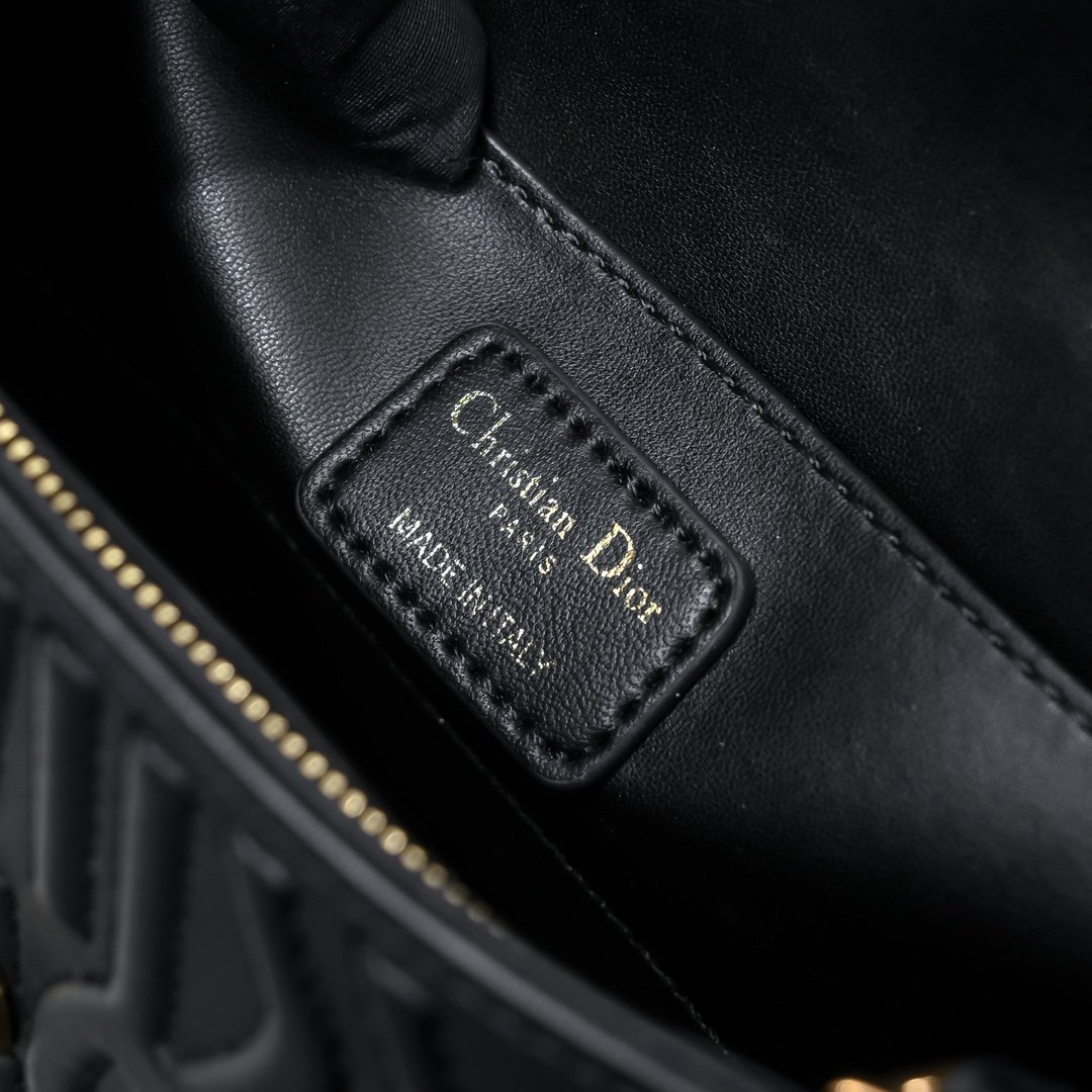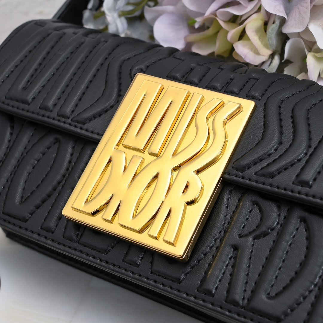 Miss Dior logo gold-finished metal plaque, magnetic flap opening and closing, adjustable leather shoulder strap, internal compartment. Dimensions: 22 x 11 x 6 cm (length x height x width). Can hold 1 mobile phone, 1 wallet and lipstick.
