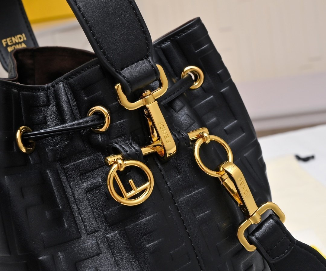 Shipment! Shipment! Shipment! ✨ Medium-sized MON TRÉSOR bucket bag. 👉8897💗 Drawstring closure decorated with metal decorative pieces in the shape of the FENDI logo. Equipped with a long shoulder strap that can be adjusted in length for shoulder or diagonal carrying. Made of black embossed calfskin🐂 and decorated with a red circular cowhide printed logo. Palladium-plated metal accessories🔱. Model 8897. Dimensions 17/15/25 cm. The shortest shoulder strap is 19 cm and the longest is 115 cm.