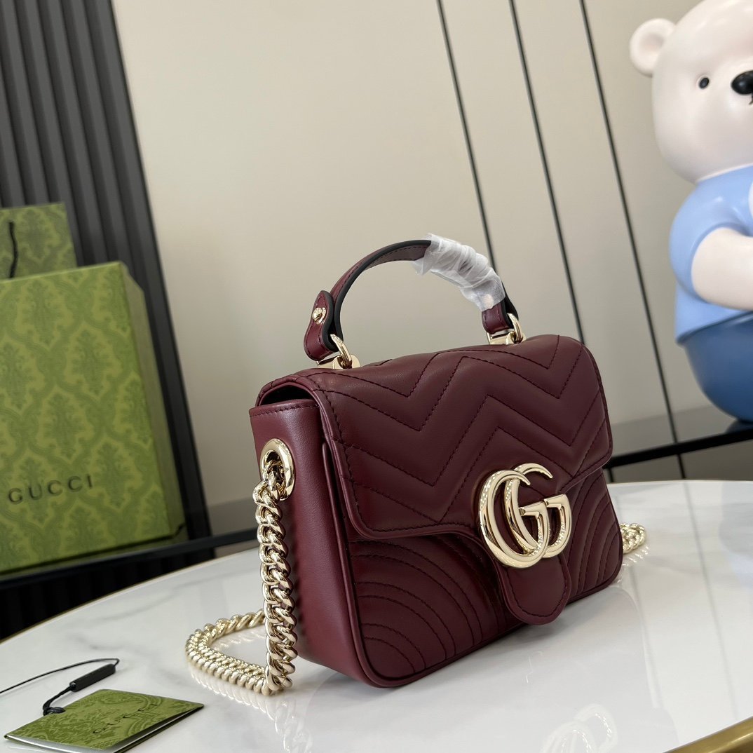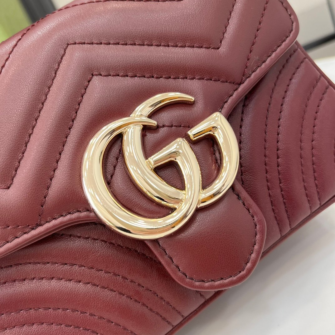 💝Complete with original green box packaging.💝 [New product] Mini handbag from the GG Marmont series. The GG Marmont series interprets a new silhouette with classic color combinations, showing the charm of early autumn. This handbag is made of Gucci Ancora Red (Rosso Ancora) quilted V-shaped leather and comes with a detachable light gold-toned chain shoulder strap with a clasp. The magnetic flap opening and closing is adorned with double Gs, doubling the charm of the entire design. Gucci Ancora Red (Rosso Ancora) quilted V-shaped leather, Gucci Ancora Red (Rosso Ancora) leather trim, light gold-toned accessories.