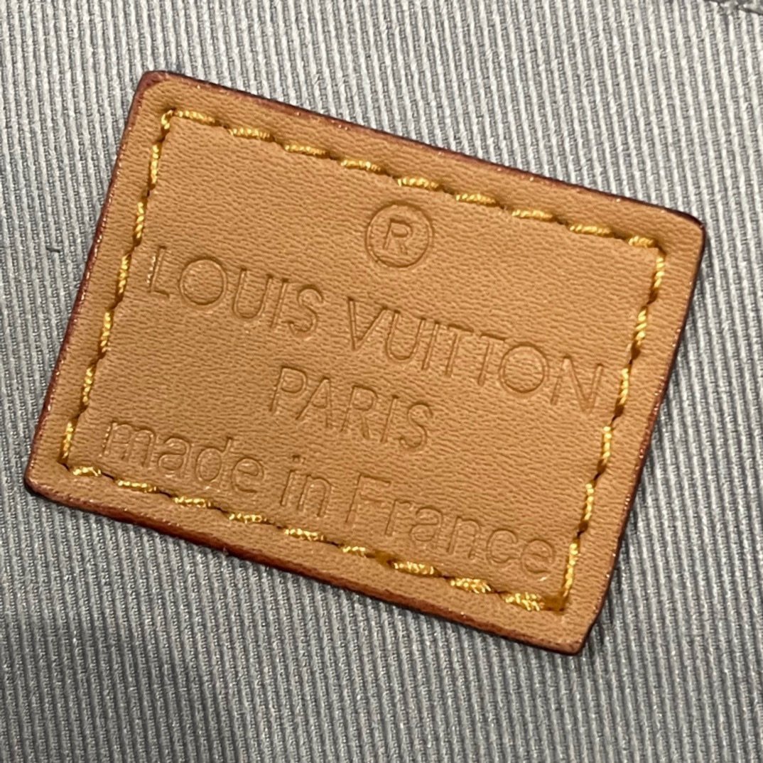 The handbag is from the brand’s collaboration series with Tyler. It presents a pocket-sized version of the Steamer handbag in Monogram Craggy canvas. The artist gives the Monogram pattern a hand-painted look. Cowhide leather shapes and reinforces the corner guards, shoulder strap, and flap.