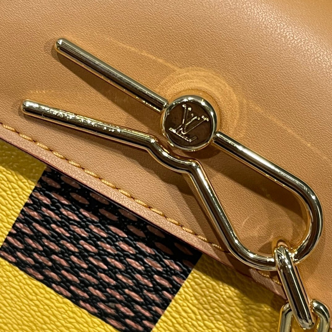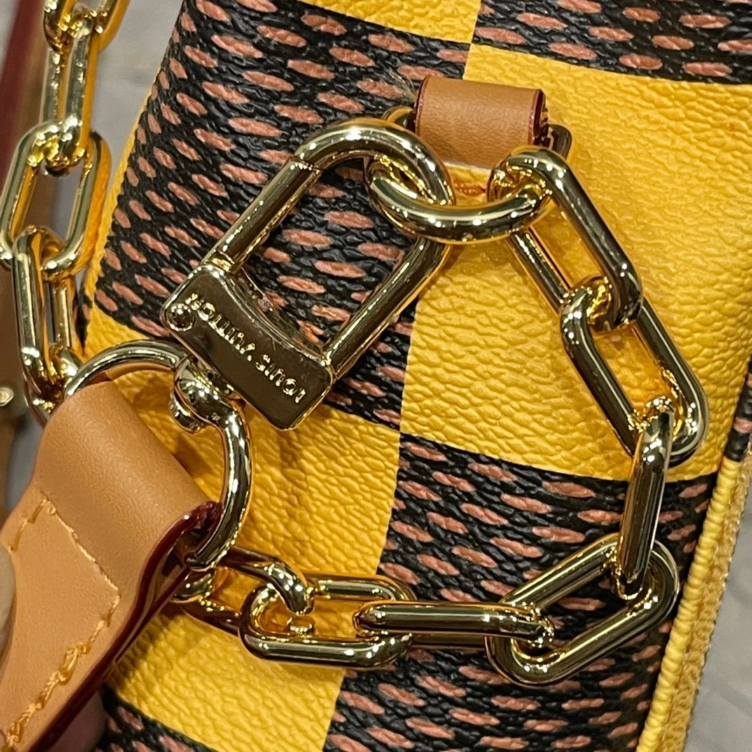 The handbag is from the brand’s collaboration series with Tyler. It presents a pocket-sized version of the Steamer handbag in Monogram Craggy canvas. The artist gives the Monogram pattern a hand-painted look. Cowhide leather shapes and reinforces the corner guards, shoulder strap, and flap.
