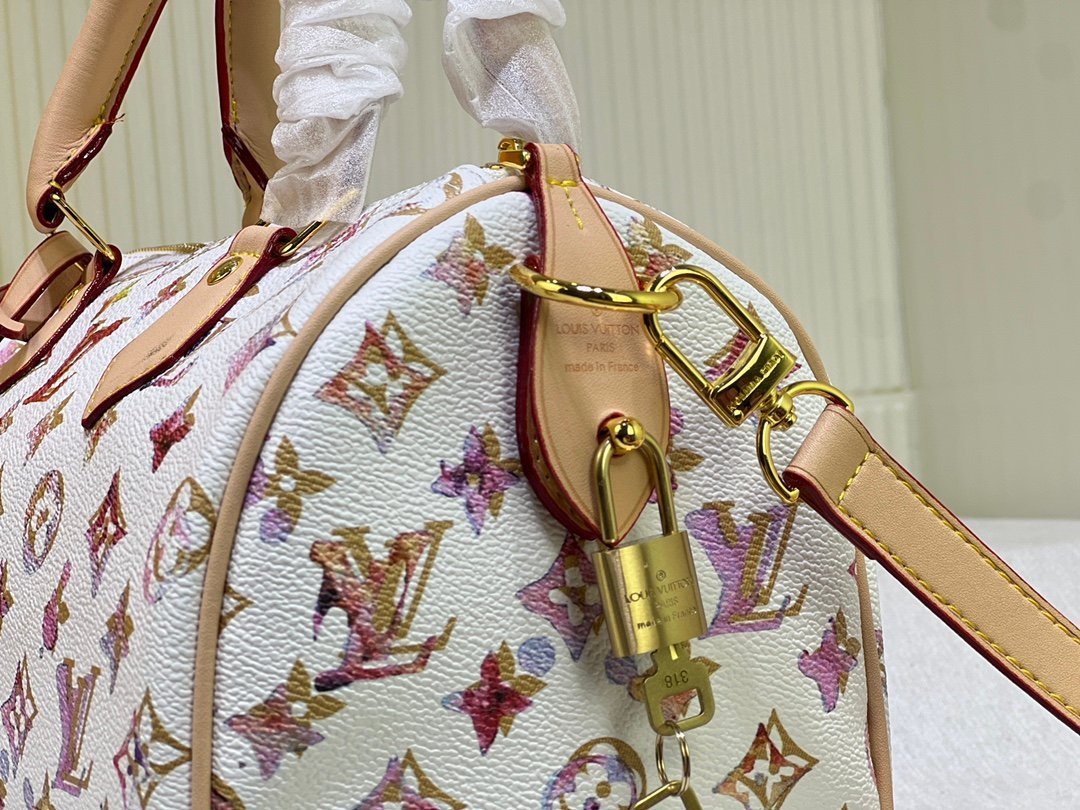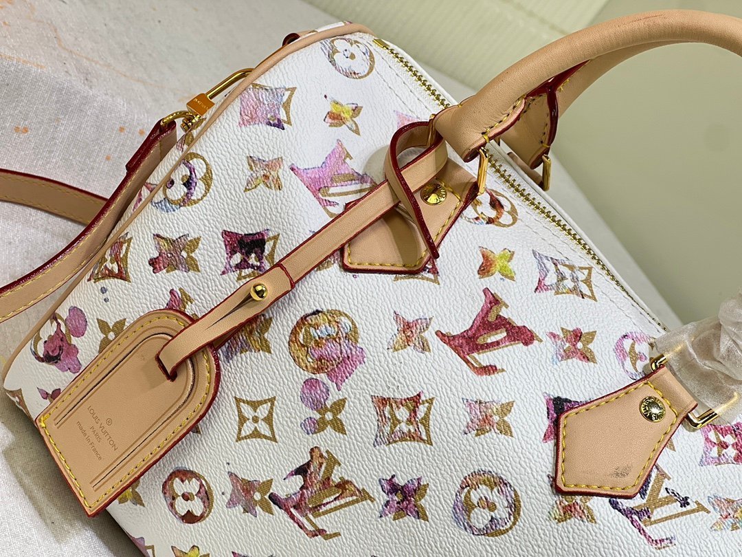 This Speedy P9 Bandoulière 25 Monogram Leather handbag is made of soft cowhide leather and reproduces the refined look of canvas printing with the Monogram pattern. Dazzling metal parts, sheepskin leather lining and nameplate together confirm the creative director Pharrell Williams’ unremitting pursuit of details. Size: 25x15x15cm.