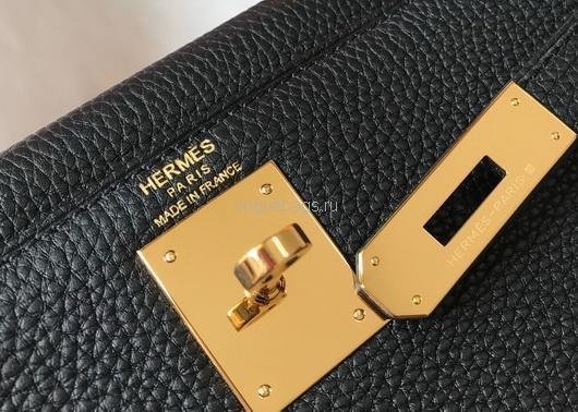 - This Kelly. in the Sellier style. is in Black Danseleather with gold hardware andhastonal stitching. two straps with front toggle closure. single rolled handle and removable shoulder strap.The interior is lined with Black chevre leather and has one open pocket on the back wall.