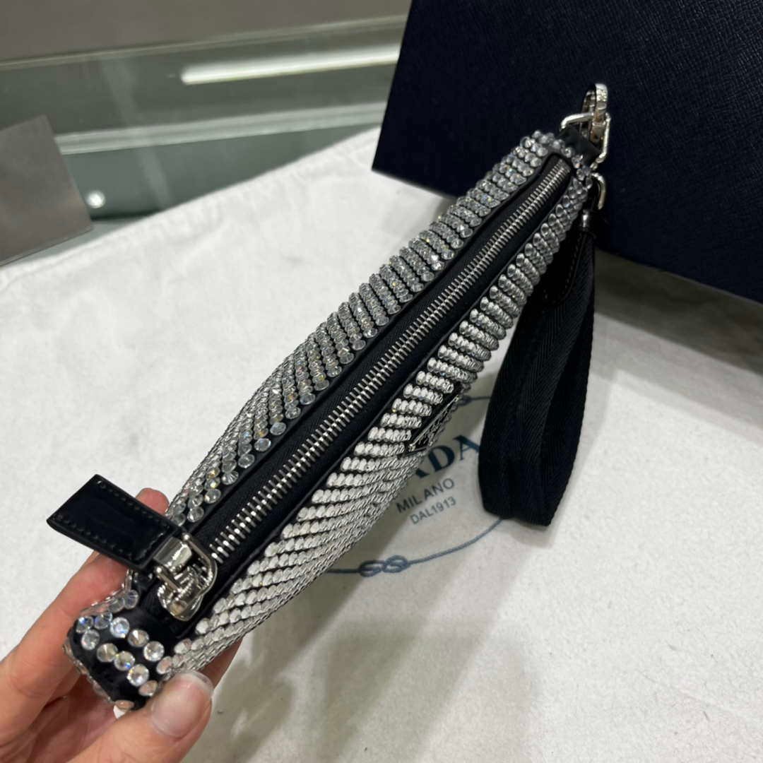 Prada 1NE039 Crystal-studded satin pouch Black on sale now.