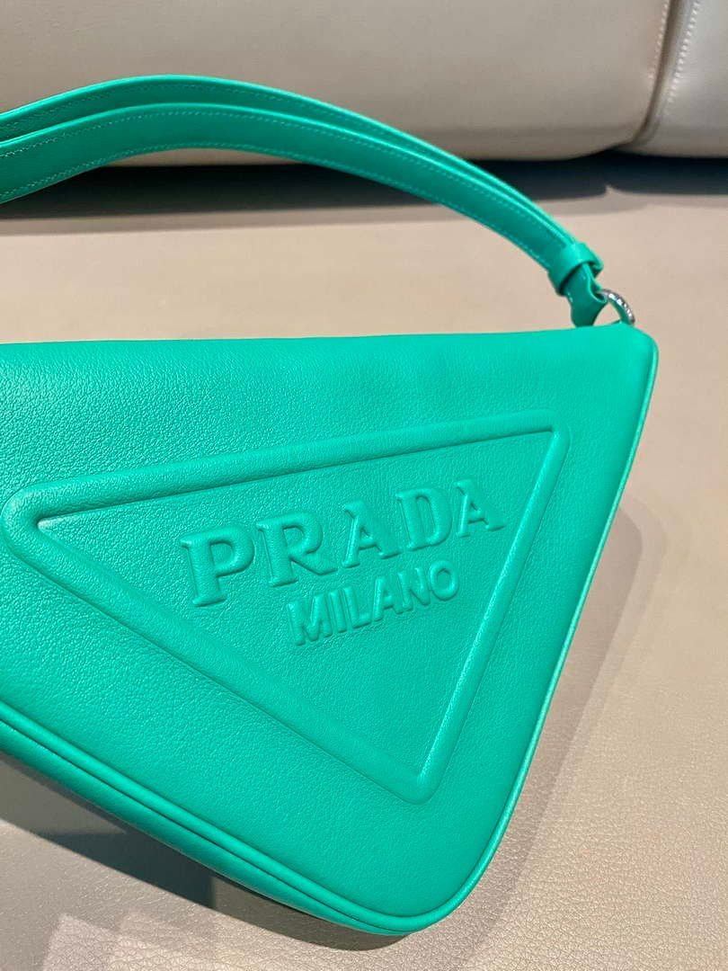 An iconic element of the brand. the Prada triangle expresses uniqueness and modernity through its universal. minimalist shape. reinvented in a different way each season. Its geometric lines inspire the silhouette of this leather pouch enhanced on the front by the embossed logo that emphasizes its contemporary character.