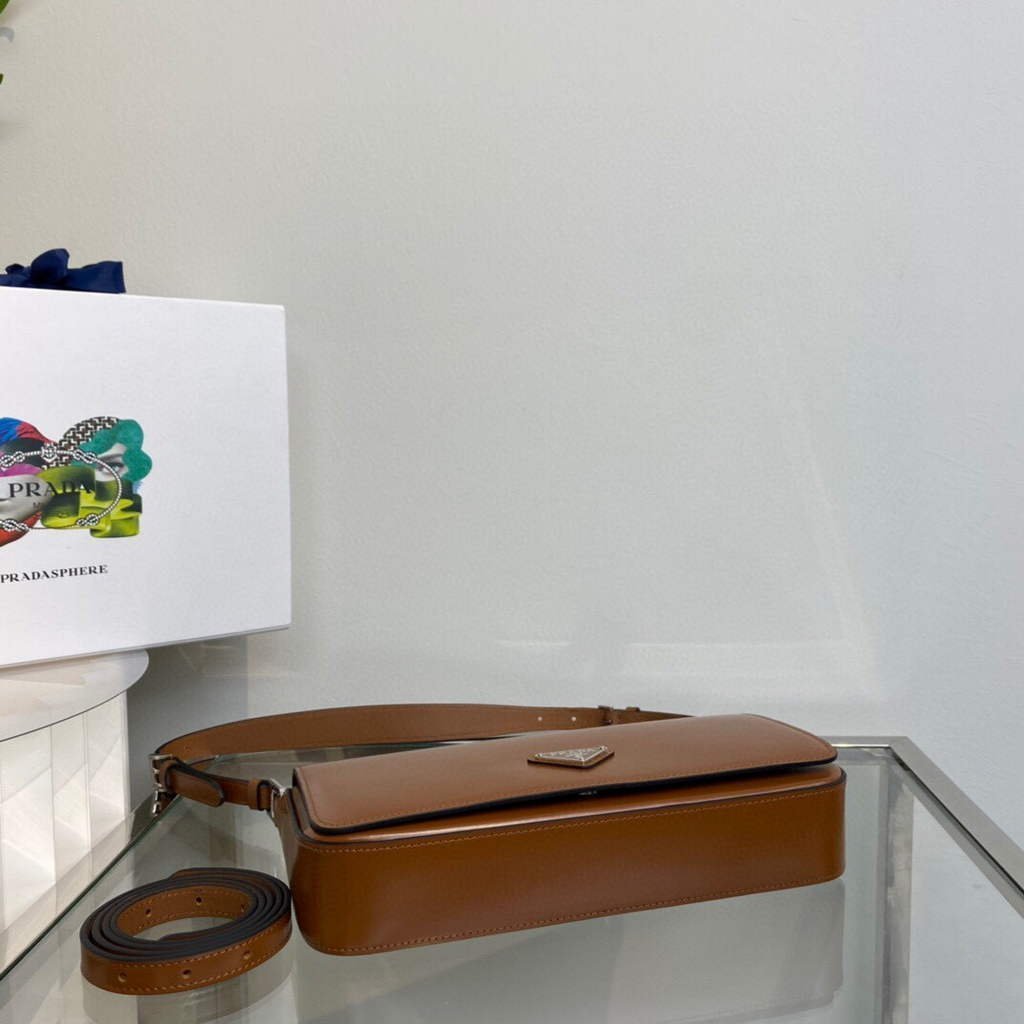 Minimalist elegance. a distinctive character and versatility meet in this shoulder bag with flap that reinterprets the geometric shape of the ’90s in a modern. current way. Made of fine brushed leather. an iconic material of Prada collections. the design with a horizontal line features a narrow adjustable shoulder strap that allows it to be worn as a crossbody or shoulder bag. The rectangular silhouette is decorated with the emblematic enameled metal triangle logo.