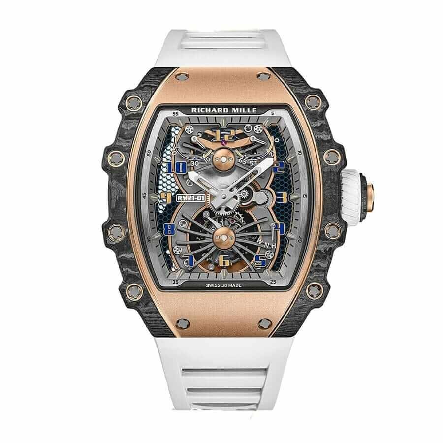 The Richard Mille RM 70-01 Tourbillon Alain Prost Automatic Replica is a luxurious watch with a 904L stainless steel case and black bezel. The case measures 49.48 x 54.88 mm and is 17.65 mm thick. The movement is an automatic caliber RM70-01 with a power reserve of 60 hours and a precision of (-3/+3 sec/day) within COSC certification limits. The second hand has a sweep motion. The bracelet is made of rubber and is adjustable for all sizes. with a 904L stainless steel fold clasp.The dial is black with triangle indices and 904L stainless steel stick hour markers and hands. The watch has a date function and a tourbillon. It has passed the 30m water resistance test and comes with a full 2 year international warranty. It is a perfect 1:1 super clone Swiss mechanism watch. with the same arrangeable serial numbers and cards. font. punto. and finishing for writings and markings. thickness. size. and powerful movement and caliber.