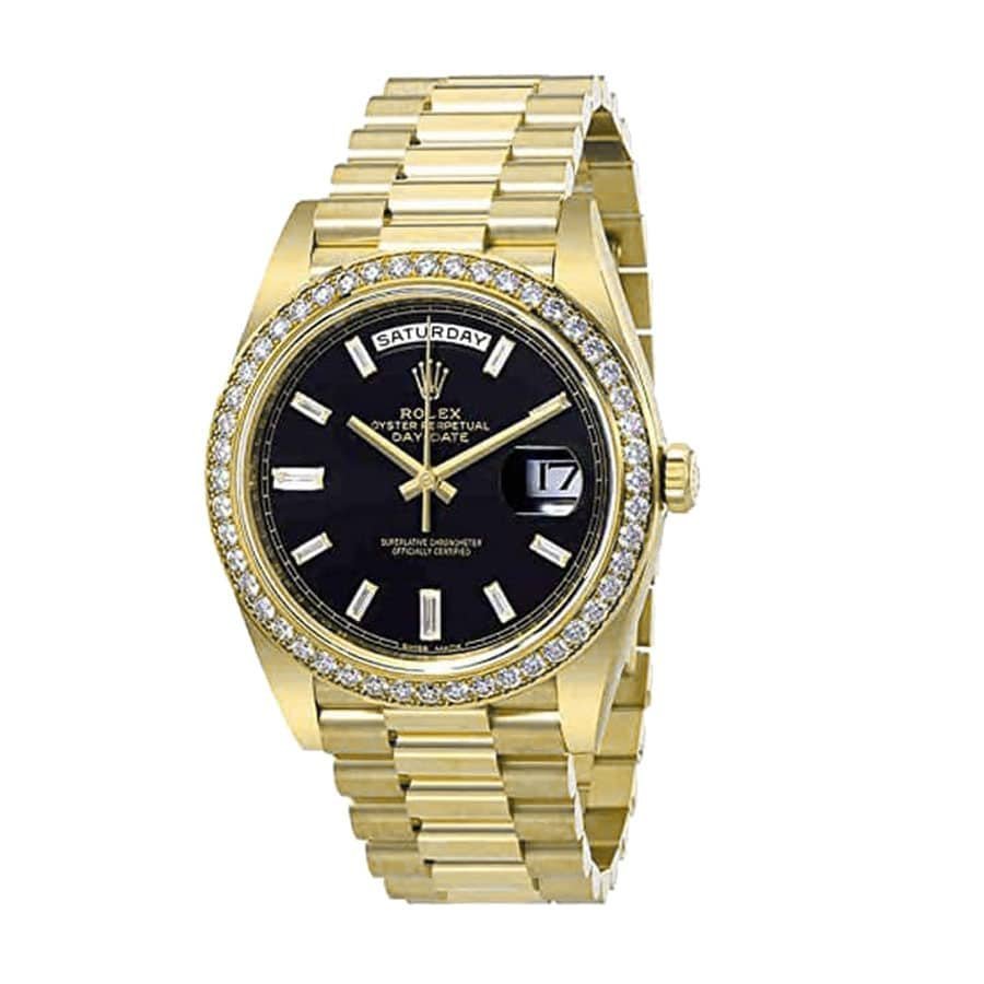 Crafted from 904L stainless steel with a majestic yellow gold color. the case of the Rolex Day-Date 228398TBR exudes a timeless elegance. while the gem-set bezel sparkles with unparalleled brilliance. The 40.00 mm sapphire crystal protects a stunning black dial. which features gem-set and stick indices that catch the light in a mesmerizing way. The hands. also made from 904L stainless steel. glide smoothly across the dial. a testament to the flawless craftsmanship embedded in every fiber of this watch.