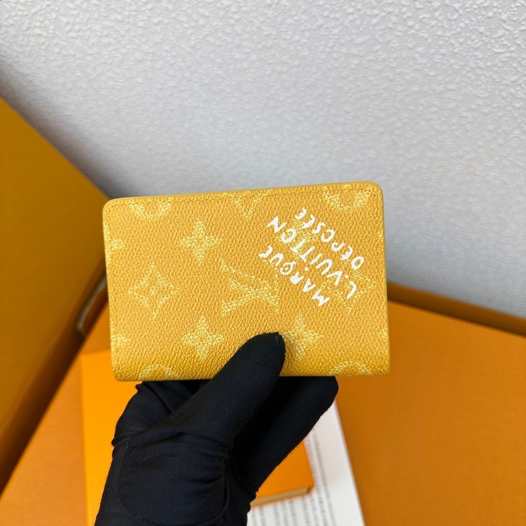 M12659 Yellow! Pocket wallet. This pocket wallet is made of Monogram Heritage coated canvas. It incorporates classic elements such as the vertical and horizontal textures of Damier check and the Marque L.Vuitton Déposée logo, showing Pharrell Williams’ modern interpretation of the Monogram pattern. 11.x 7.5