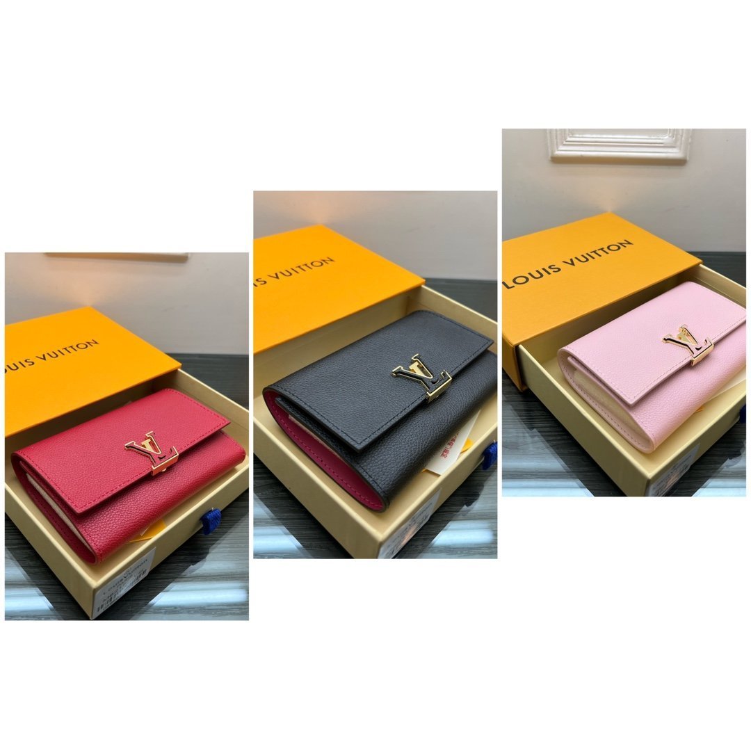 M62157 is crafted in Taurillon leather, and this Capucines mini purse is versatile and spacious to accommodate everyday belongings. The elegant bag wallet’s construction is ingeniously original and consists of two folding vertical lids, providing plenty of room for credit cards, change and banknotes. Size: 13.5 * 9.5 * 1.5cm