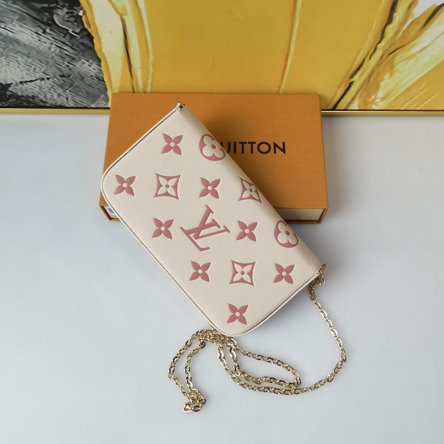 M83025 This season’s Pochette Félicie is reinterpreted in soft Monogram Empreinte leather. The soft two-tone color scheme highlights the embossed letter pattern. A stylish and versatile pouch comes with two removable pockets and a gold chain. You can use it as a shoulder bag or as a clutch after removing the chain. Size: 21*12*3cm.
